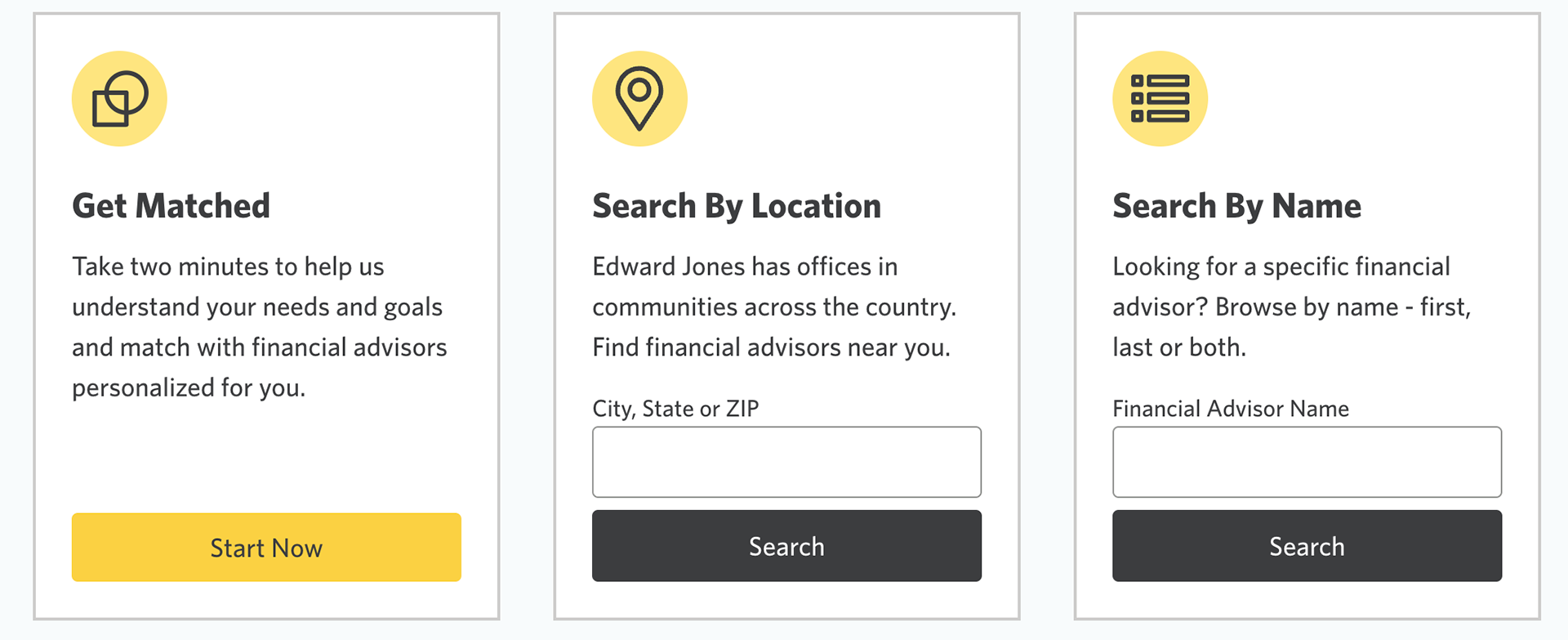 Each card provides a different way for the user to find a financial advisor.
